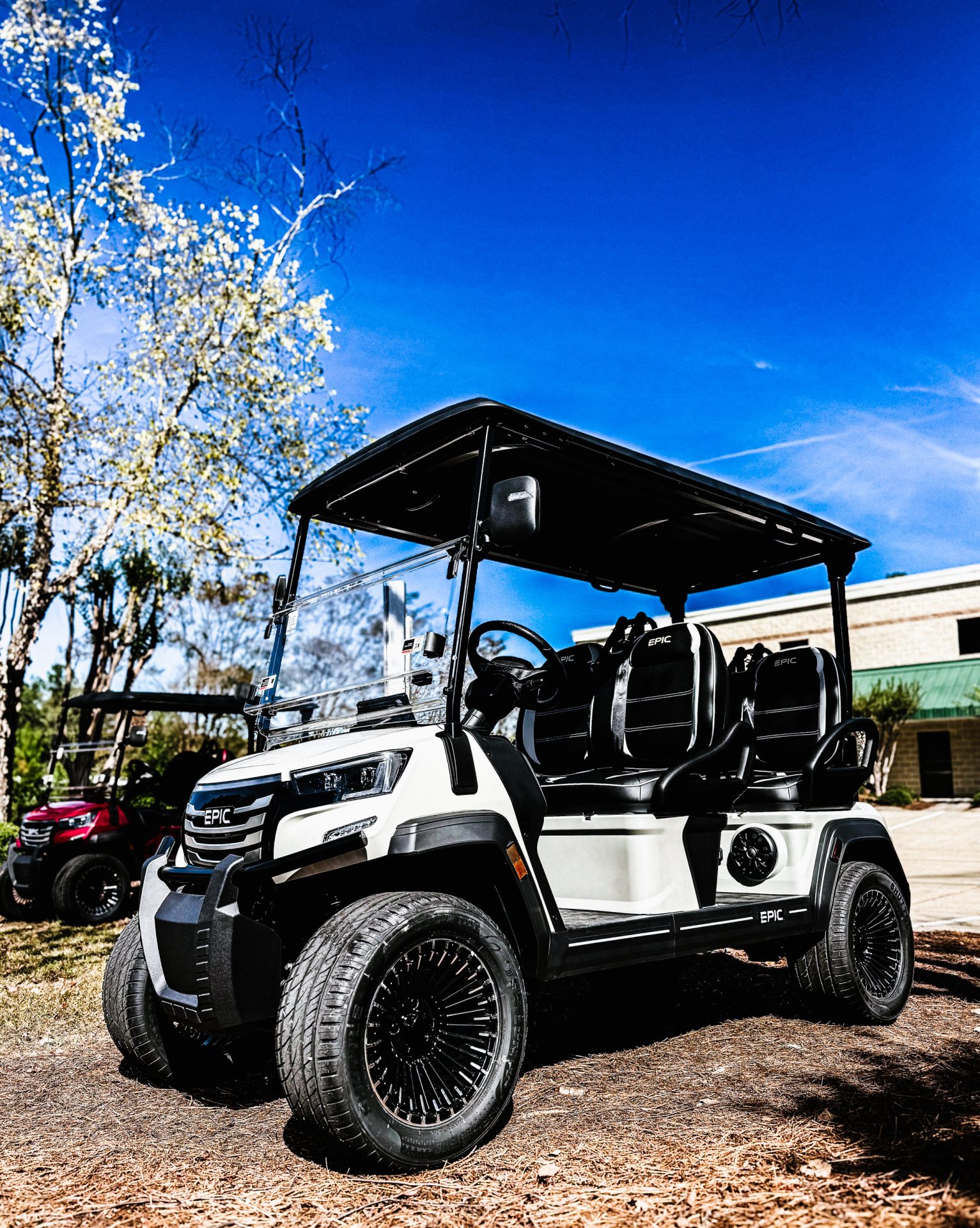 you can't go wrong with this stunning pearl white street legal golf cart! All forward facing seats with 3-point seatbelts for the whole family's safety and your peace of mind